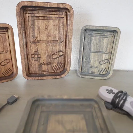 Unleash nostalgia in your space with our Handcrafted Wooden Tray featuring a meticulously designed inlay inspired by the golden era of gaming consoles. Crafted from high-quality 3/4" poplar wood, these trays serve as a stylish homage to retro gaming without explicitly referencing specific branding. Choose from the large variant (7" wide x 10-1/4" tall) for a bold statement piece or the small variant (5-1/4" wide x 7-3/4" tall) for a subtle touch of gaming charm.